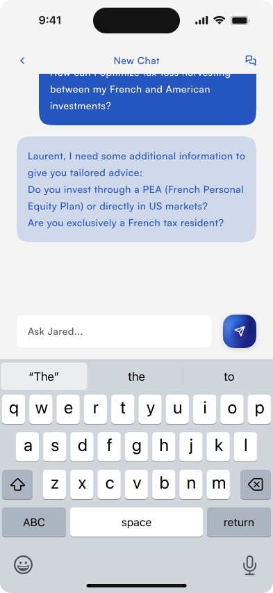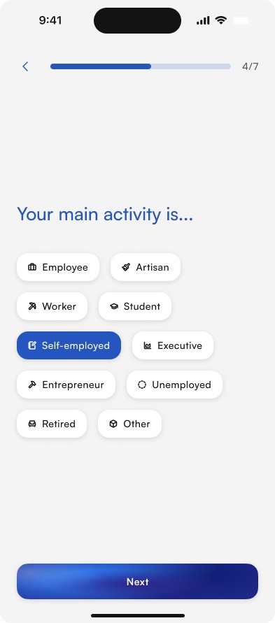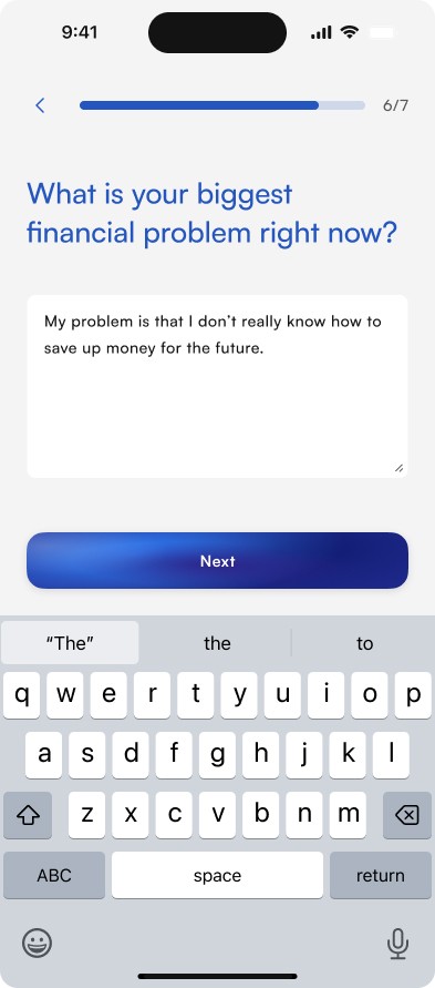 A short conversational start, then single question steps with native inputs. This keeps focus high, collects the facts that matter, and personalizes goal suggestions without slowing users down.